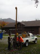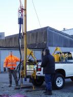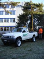 - schwere Rammsonde (siehe nachfolgende Fotos; Bärgewicht 63.5 kg, Fallhöhe 50 cm, Spitzenquerschnitt 15 cm2) auf geländegängigem Pickup-Fahrzeug (auf weichen Böden weniger geeignet)
