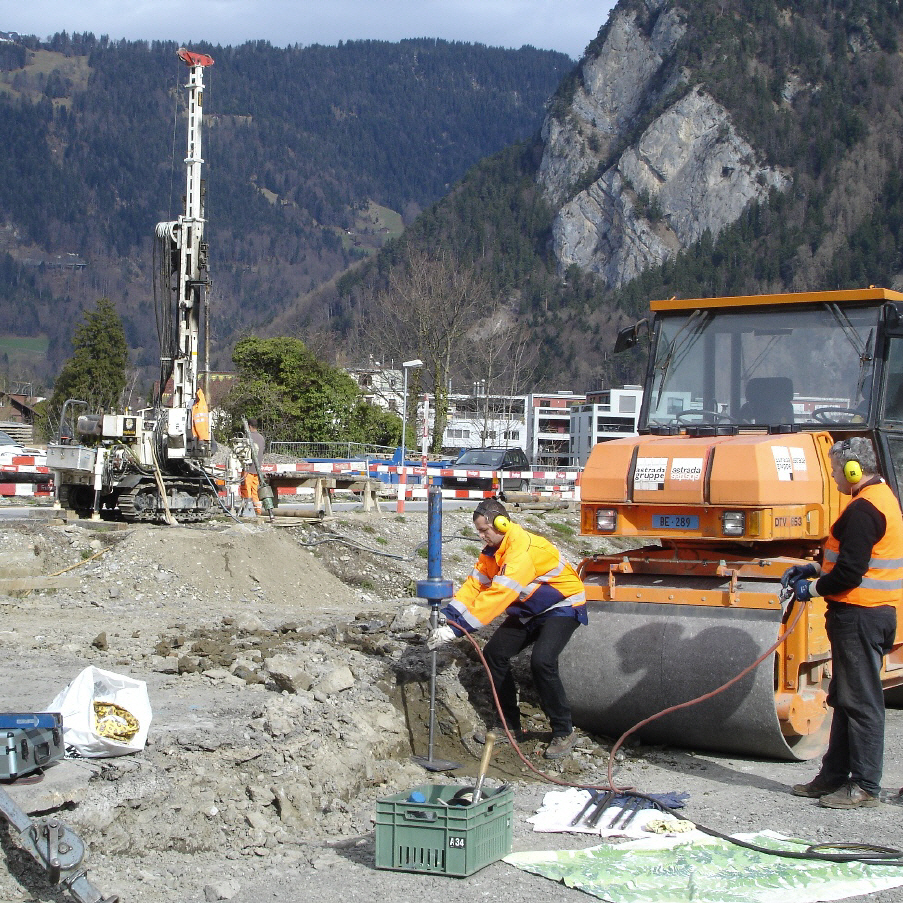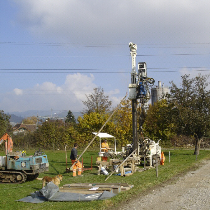 Zwei, bis 16 m tiefe Bohrungen im grundwasserführendem Schotter, mit SPT- und Pumpversuchen und technische Wasseranalyse (Wärmepumpe); 6 Rammsondierungen und Setzen von Piezometern, Grundwassermessungen.