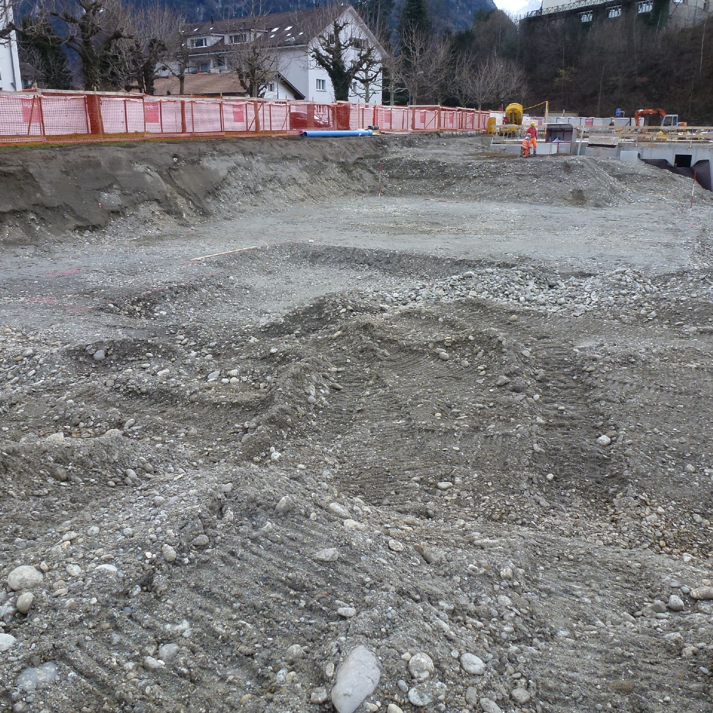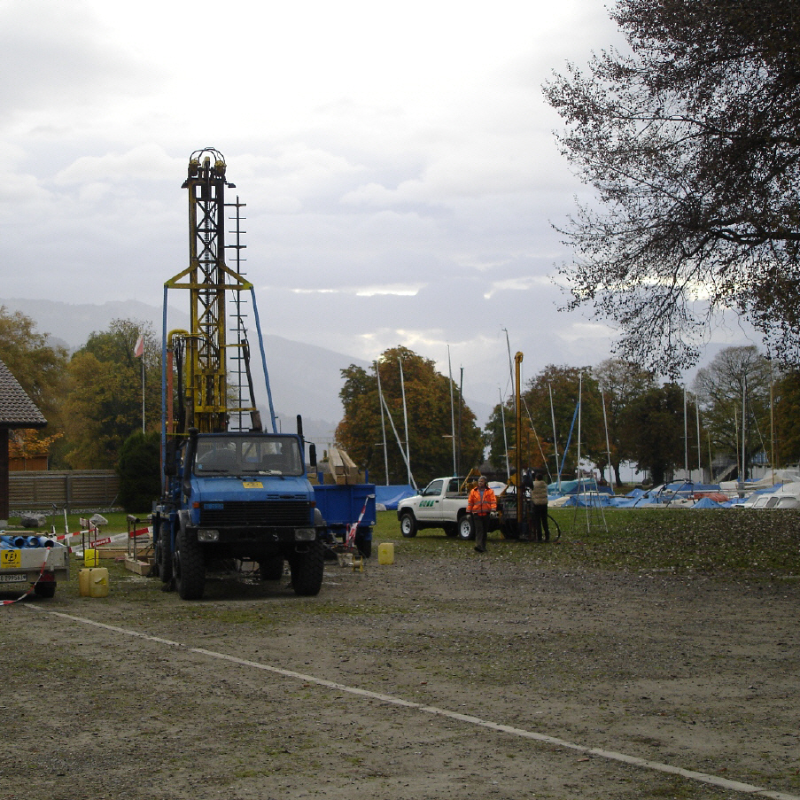 Zwei, bis 26 m tiefe Sondierbohrungen im grundwasserführenden Schotter und in Delta- und Seeablagerungen, mit SPT- und Drehflügelversuche und Entnahme einer ungestörten Bodenprobe (Ödometerversuch); Baggerschlitze und Setzen von Piezometern.